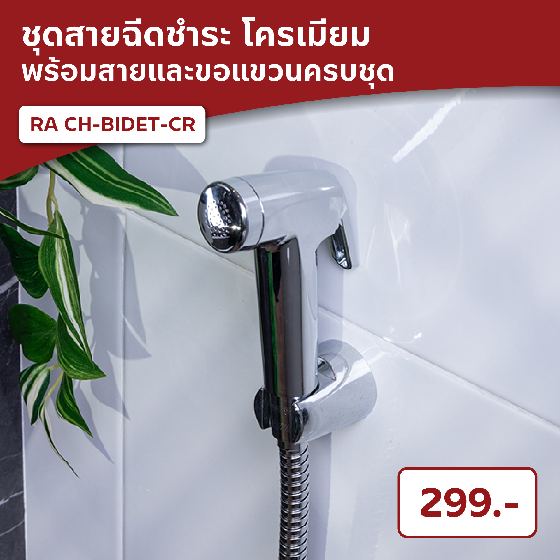 RA CH-BIDET-CR สำหรับห้องน้ำที่ต้องการความสะอาดเงางาม แนะนำชุดสายฉีดชำระ ABS สีโครเมียมเงา ที่หัวสเปรย์ออกแบบให้ก้านกดสามารถล็อกน้ำได้ เพื่อล้างชำระพื้นหรือสิ่งอื่นๆ ที่สกปรกในห้องน้ำได้โดยไม่ต้องใช้มือกดแช่ สายผลิตจากสแตนเลส ความยาว 130 ซม. มาพร้อมขอแขวนกำแพง สร้างความสวยงามในห้องน้ำ หัวฉีดรับประกันไม่รั่วซึม 1 ปี