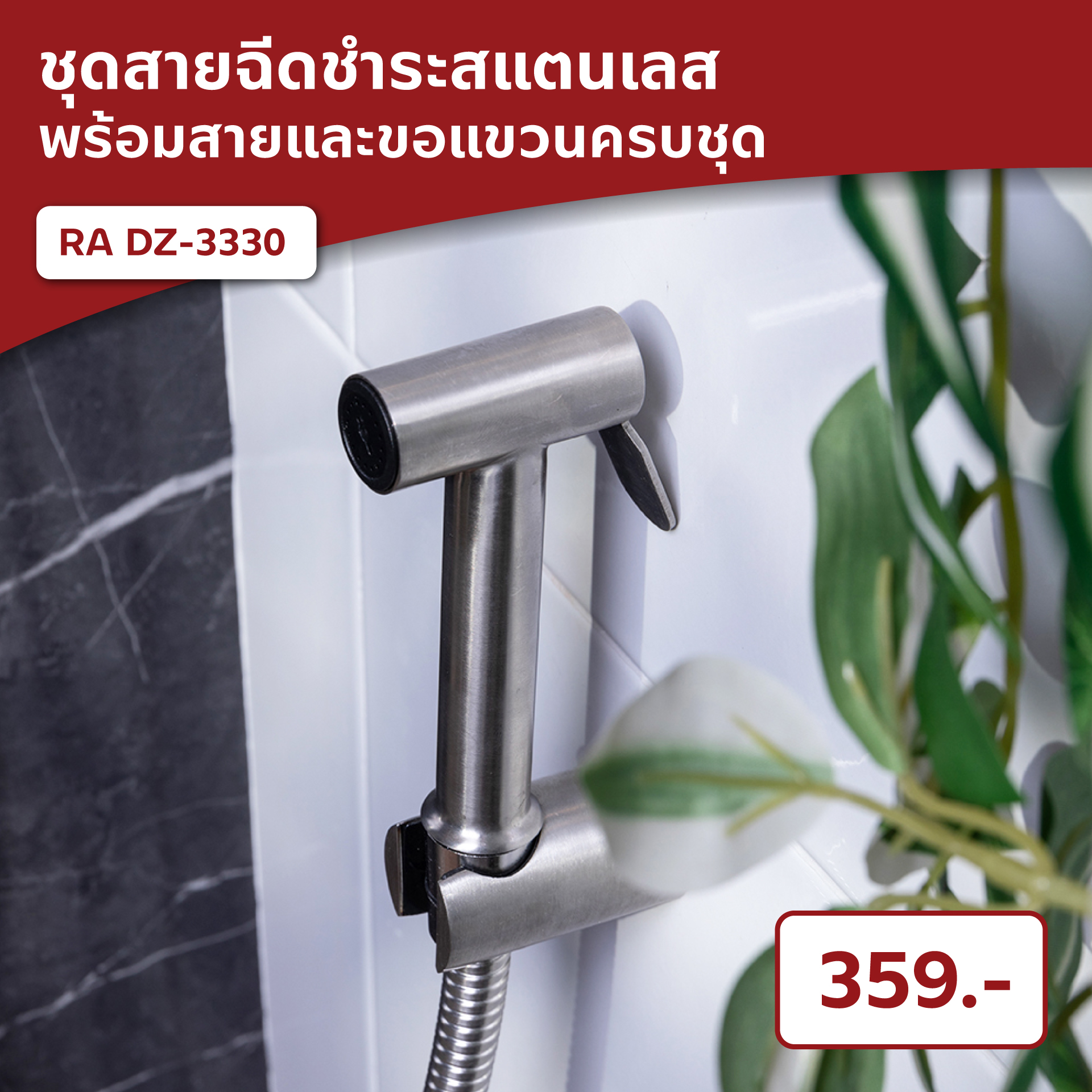 RA DZ-3330 ใครที่ต้องการความเบา สบายมือ และแรงดันที่พอเหมาะ ต้องลองรุ่นนี้ ชุดสายฉีดชำระสแตนเลส เกรด 304 ทนทาน ไม่ขึ้นสนิม ไม่เป็นรอยคราบน้ำ หัวฉีดออกแบบให้ก้านกดสามารถล็อกน้ำได้ สายน้ำนุ่มนวลเป็นสเปรย์ตรง ใช้งานสะดวก แถมยังรับประกันหัวฉีดไม่รั่วซึม 5 ปีอีกด้วย
