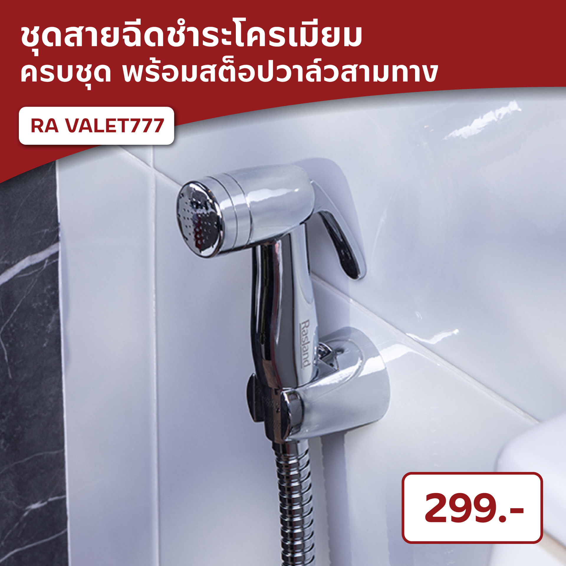 RA VALET777 เหมาะกับคนที่เน้นความคุ้มค่า เพราะมาแบบชุดพร้อมใช้งาน กับชุดสายฉีดชำระ ABS ชุบโครเมียมเงา หัวสเปรย์ออกแบบให้ก้านกดสามารถล็อกน้ำได้ มาพร้อมสต็อปวาล์วสามทาง สำหรับต่อกับหัวฉีดชำระและชักโครก ผลิตจากซิงค์ชุบโครเมียมเงา สายชำระผลิตจากสแตนเลส ความยาว 130 ซม. มาพร้อมขอแขวนกำแพง โดยหัวฉีดรับประกันไม่รั่วซึม 1 ปี